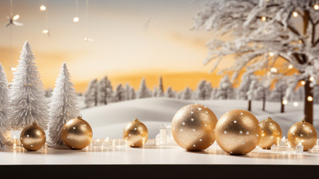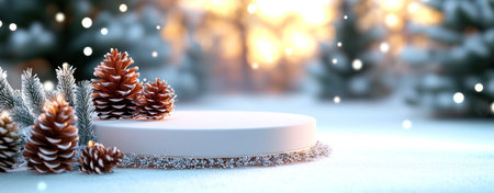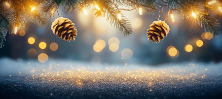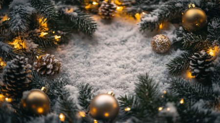 A beautiful winter scene featuring soft snow, pinecones, gold ornaments, and warm lights, perfect for invoking a festive mood during the holiday season.