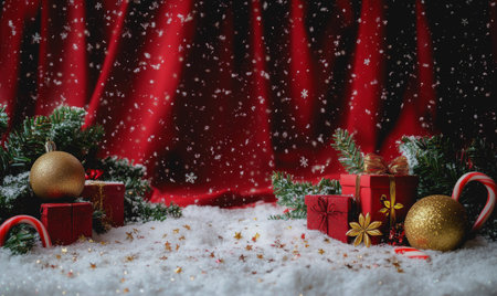 Red Christmas background with gifts, candy canes, and snow in a festive and minimalist design.