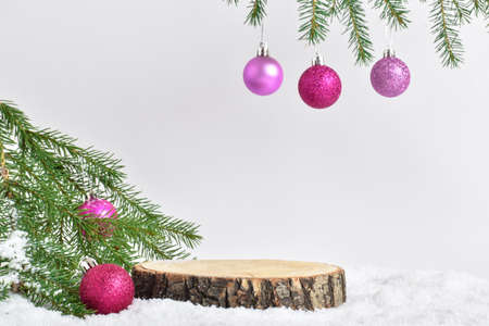 Minimal. Christmas background with a piece of wood in the snow, a fir branch and purple glass balls. copy space