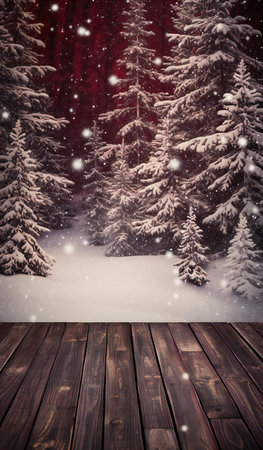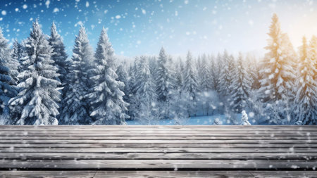 Winter background with an empty wooden surface, snow-covered coniferous trees, snow and place for text. AI generated