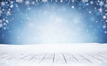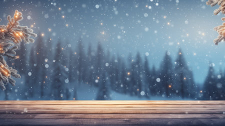 Wooden table and winter forest background with snowflakes and bokeh