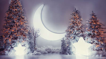 Scenery winter xmas banner, landscape beautiful decorated christmas tree with star and moon with snow