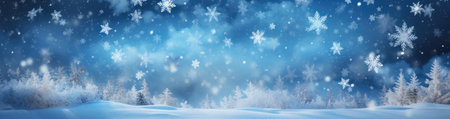 Banner, Winter forest at night with snowflakes. Panoramic banner