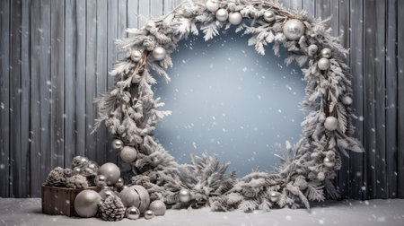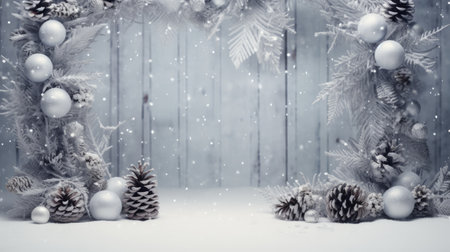 snowy christmas background silver illustration landscape branches, leaves pinecones, wooden door silver snowy christmas background