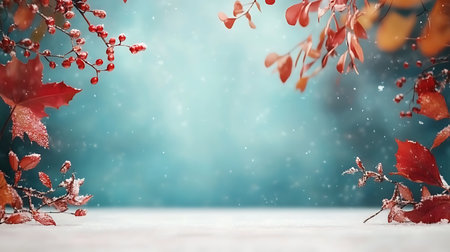 Winter background with red leaves, snowflakes and bokeh