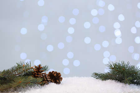 Fir branches and cones on snow against blurred lights