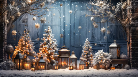 winter yard with Christmas decorations and Christmas tree, space for text. Christmas background.