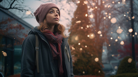 A close-up portrait of a young woman in a snowy, winter landscape adorned with sparkling lights. The scene evokes warmth and holiday spirit, highlighting beauty in a serene moment.