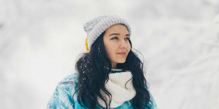 Beautiful young woman in winter jacket, knitted beanie hat and scarf, outdoors in the forest on snowing winter day.