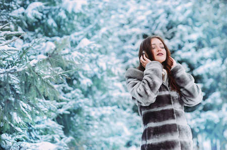 beautiful girl with headphones listening to music in the winter forest