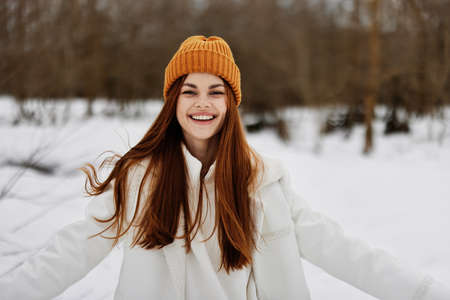 cheerful woman Walk in winter field landscape outdoor entertainment winter holidays