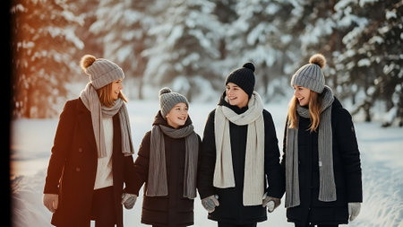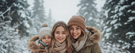 Smiling women and a child dressed in cozy winter clothing, standing outdoors in a snowy pine forest. Warm hats, scarves, and fur-lined jackets create a festive winter vibe. Perfect for holiday, lifestyle, and family-themed projects.