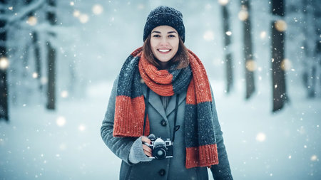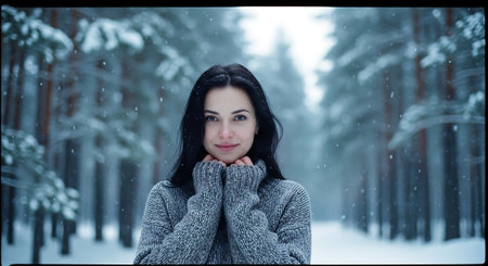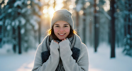 A young woman in a winter landscape, wearing a cozy sweater and a beanie, surrounded by snow-covered trees, evoking a serene and chilly atmosphere