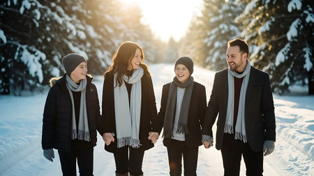 Joyful friends playing in the snow during a sunny winter afternoon in a serene forest landscape