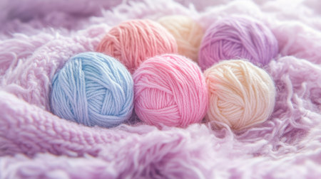 Explore the beauty of soft yarn balls in pastel shades of pink and purple on a textured knit blanket. Ideal for art, crafts, and home d