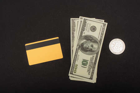 KYIV, UKRAINE - APRIL 26, 2022: Top view of dollars near credit card and silver bitcoin on black background