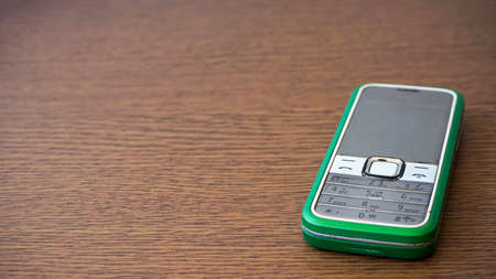 Close-up of old mobile phone on wooden table.