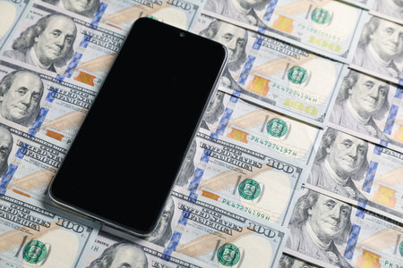 Smartphone on dollar banknotes as background, closeup