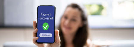 Paying with smartphone for online shopping. Paying using fast secure payment system. Paying bills using express payment technology. Paying expenses online. Ordering product online using smartphone. Confirmation payment successful displayed in store app on smartphone screen. Express payment
