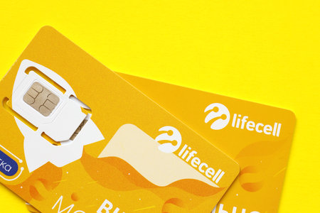 TERNOPIL, UKRAINE - JULY 5, 2022: Lifecell new sim card with free contract on yellow background. Lifecell is a Ukrainian mobile telephone network operator and provider of wireless internet connection
