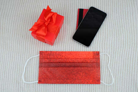 Virus protection and online shopping. Red medical mask, cellphone, bank card and gift box on knitted cozy background. Mock up
