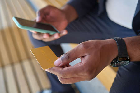Close up picture of a man holding a credit card and a smartphone