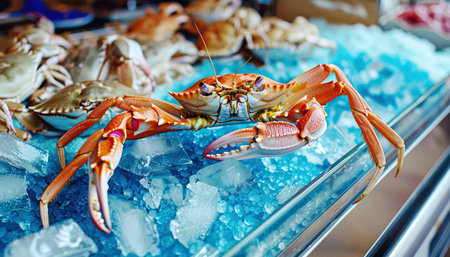 Red crabs background lying in seafood store. Healthy natural meals concept image.
