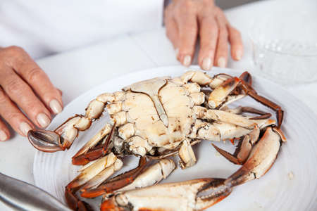 Close up of the process of breaking down a fresh crab to take out the flesh