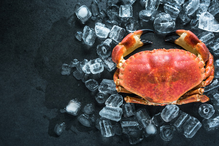 Fresh crab for cooked food at restaurant or seafood market / Raw crab on ice with spices lemon and salad lettuce on the dark plate background ,Blue swimming crab
