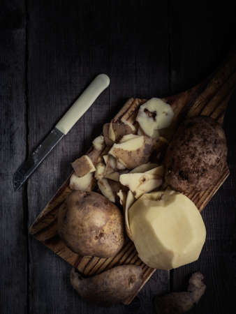 raw peeled potatoes on old cutting board and kitchen knife close-up view from above. tinted photo