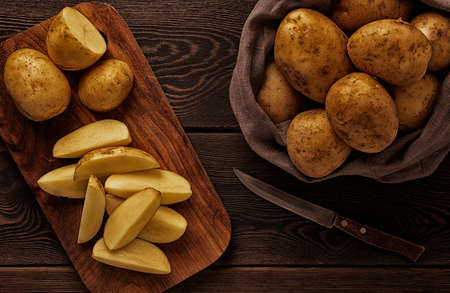 Raw potatoes, sliced on a wooden table, top view, no people,