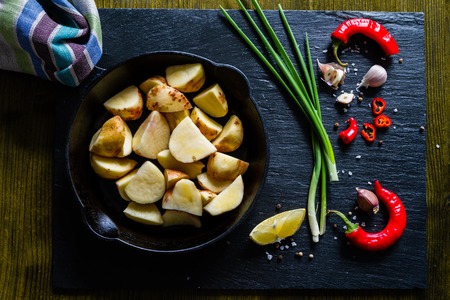 Potato wedges on dark background, cooking process. Process of making a rustic recipe of aromatic baked potatoes. Cheap and easy home cooking.