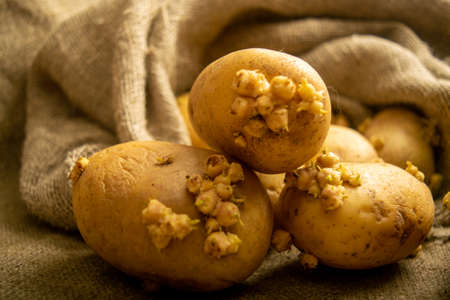 Sprouted potatoes on a background of coarse sacking. Autumn harvest. Seed potatoes for planting. Close up