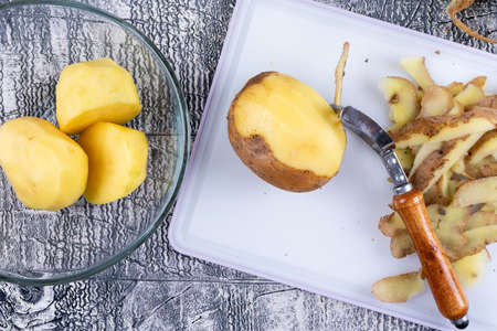 Top view peeled off potatoes in bowls with potato peeler, peels, cutting board on gray wooden background. horizontal