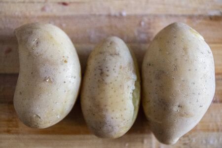 Potatoes on wooden boards rustic style in a modern and trendy style.