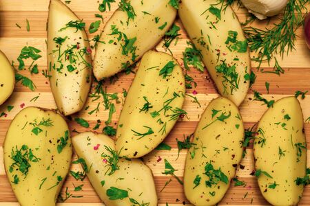 Sliced potatoes and sprinkled with herbs on a cutting board