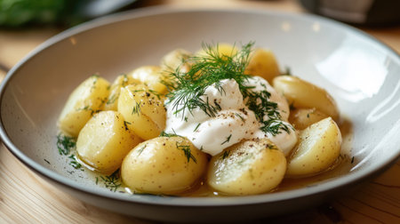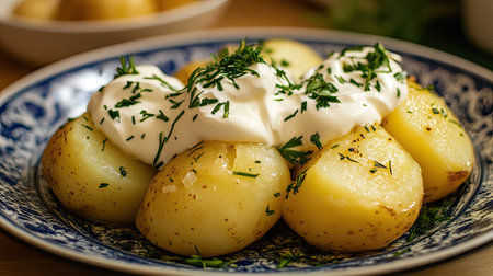 Boiled potatoes arranged neatly on a plate, topped with sour cream and garnished with herbs. A warm and comforting homemade dish.