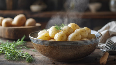A bowl of fresh boiled potatoes emits a gentle steam, complemented by a sprig of green herb. Perfect for showcasing wholesome, rustic cooking.