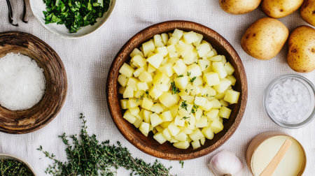 A rustic arrangement of fresh diced potatoes with herbs, garlic, and salt, perfect for meal preparation and showcasing wholesome cooking ingredients.