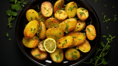 A black bowl filled with potatoes and a slice of lemon. Generative AI image.
