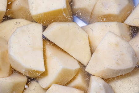 Closeup slices of a raw potatoes in bubbling water in pot. Potato background.