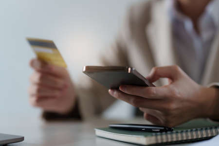 People are holding credit cards and smartphones to pay for products ordered through the website. Credit cards can pay for products online. Online shopping ideas.