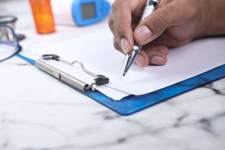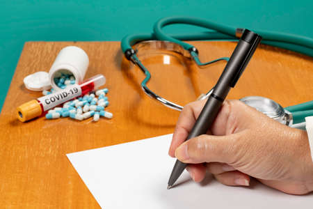 Hand of a doctor filling out form in an office for a patient with suspected covid-19