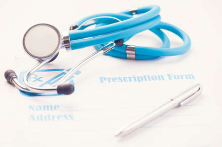 Medical prescription with doctor's sthetoscope and pills closeup.