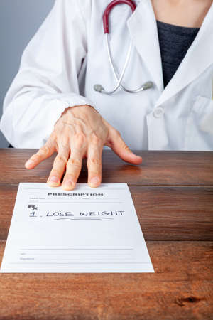 A caucasian female physician in white coat is prescribing Lose weight to an obese or overweight patient in her office. A concept image for lifestyle modifications, obesity, weight gain, problems,