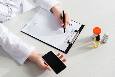 cropped view of doctor writing prescription near bottles with cbd and medical cannabis while holding smartphone with blank screen