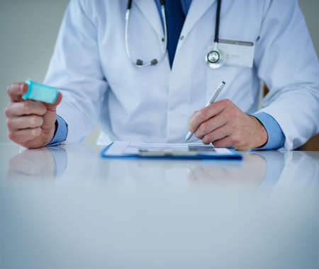 The doctor on a white background reads the instructions for medicines. The specialist looks at the list and composition of the drug. The concept of a professional treatment appointment