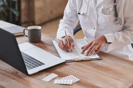 Unrecognizable female doctor wearing white coat sitting at desk in loft office writing something in papers