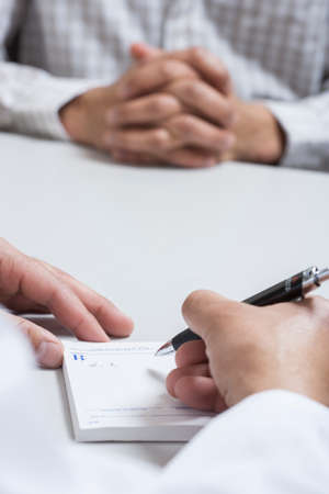 GP hands holding silver pen prescribing recipe for patient clipped to pad close-up. Illness prevention pharmacology and healthy life concept