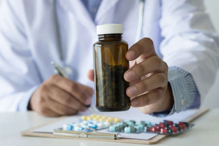 Female doctor holding unlabeled bottle of various pills and medication, prescription medicine and healthcare, selective focus
